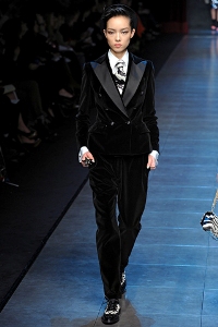 Туфли ниже щиколотки со шнуровкой и на низком каблуке, костюмы с точеным силуэтом, накрахмаленные воротнички рубашек, брюки с подтяжками, галстуки и бабочки. Обычно одежда такой модели должна подчеркивать достоинства фигуры и скрывать недостатки. Для придания образу женственности можно накрасить губы красной помадой, а вместо «мужских» туфель отдать предпочтение классическим лодочкам на высоком каблуке. Основной цветовой гаммой стиля денди остается черно-белая палитра.
